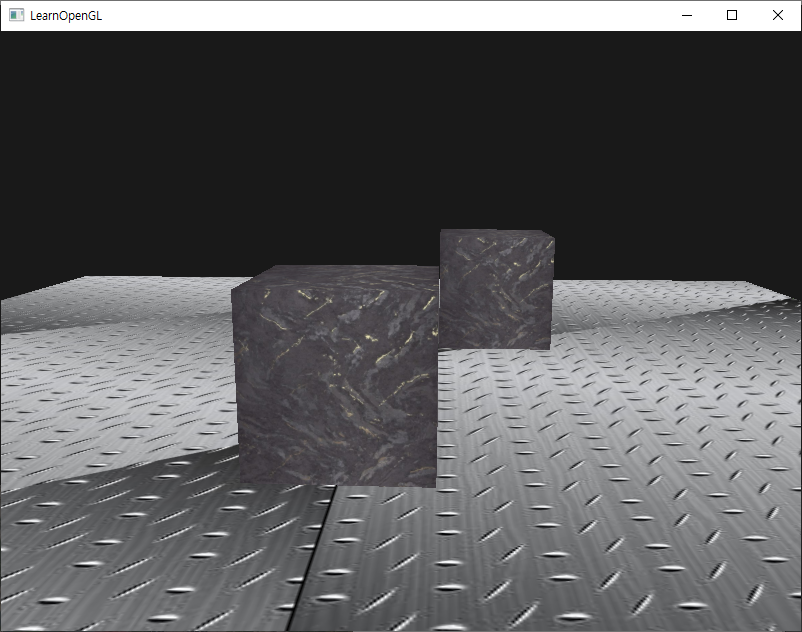 일단 텍스처를 입힌 바닥 위에 텍스처를 입힌 2개의 큐브가 존재하고 조명이 없는 기본적인 scene을 렌더링하는