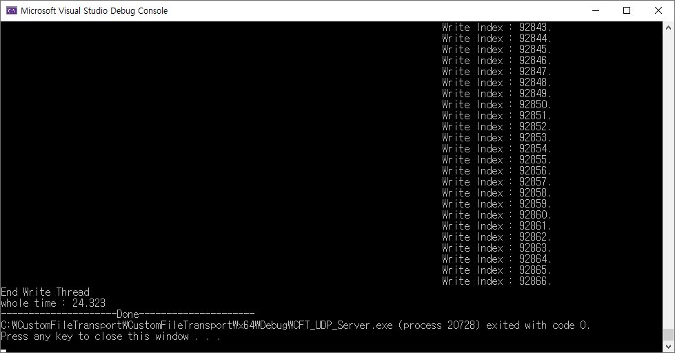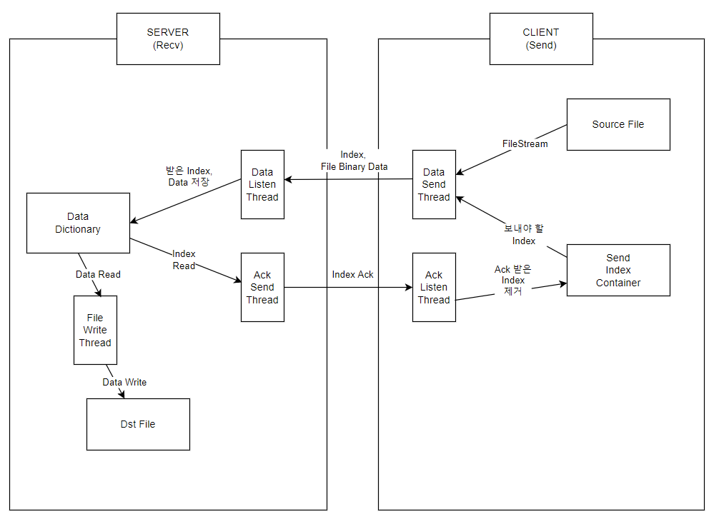 Server측은 Client와 다르게 Listen, Send 쓰레드 외에도 File Write 쓰레드가 하나 더 있는데,